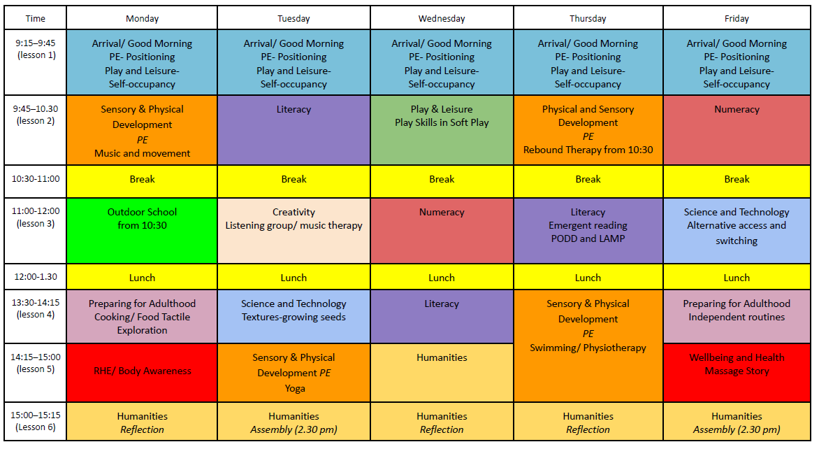 | - Average length of lesson for this cohort is 30 to 45 minutes per lesson (if considerably shorter/longer time needed due to the specific needs of the cohort consider whether you then need to add or remove lessons in the day to ensure coverage) - Scheduled break times should not extend beyond 45 minutes maximum (to include personal care and postural changes). |