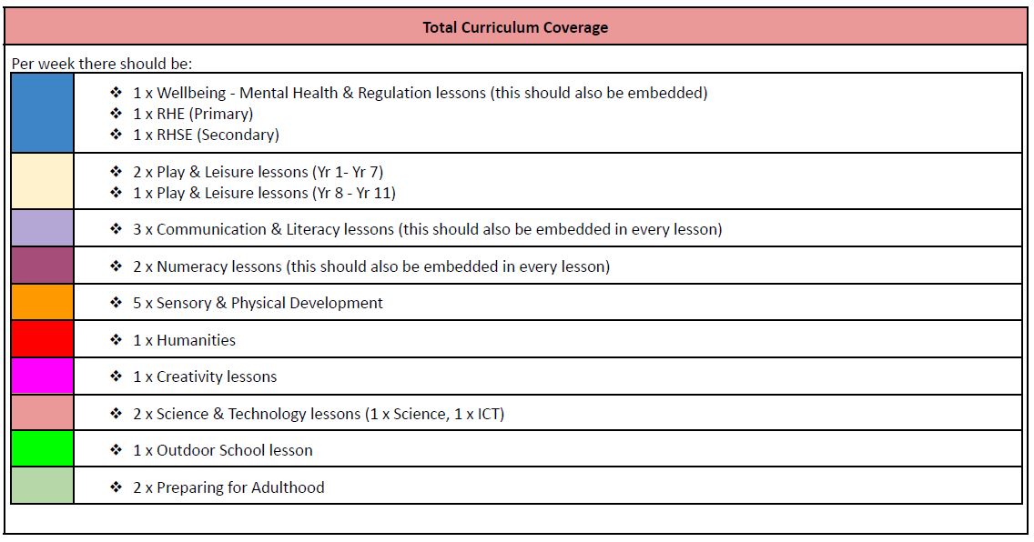 | Minimum of 1 Mental Health & Regulation lesson per week - from the Regulation Curriculum 1 x Relationships and Health Education per week (Primary cohort) 1 x Relationships, Health and Sex Education per week (Secondary cohort) |